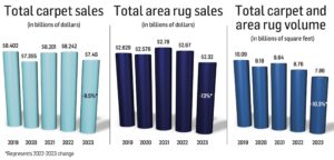 When all the figures were tabulated for 2023, FCNews research found that total carpet sales declined 9.5% in dollars to $7.46 billion from $8.24 billion in 2022. Residential carpet sales, meanwhile, fell 13% in 2023 while commercial sales were down 3.9%. Area rug sales (not including customized rugs fabricated from broadloom) decreased an estimated 13% to $2.32 billion, according to industry estimates.