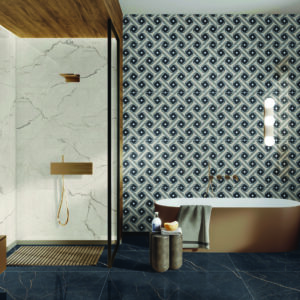 While the gray and beige trend isn’t completely gone, broader design movements in interiors have begun to reflect a move away from minimalism toward warmer, more maximalist palettes post-pandemic. As such, bold colors are making a vibrant comeback in ceramic and porcelain tile design, as consumers and designers alike seek to infuse more personality into their spaces. From rich emerald greens and deep navy blues to saturated terracottas and sunny ochres, today’s tile palettes are stepping beyond neutrals to make personal, expressive statements. These hues aren’t just for accents either—many are being used in full installations on focal walls and even floors, creating immersive environments for those that live with them.