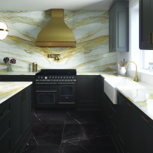 With intricate streaks of amber and honey-toned hues cascading across the surface, Daltile’s Panoramic Golden Angelite is designed to exude warmth and sophistication. An ideal choice for luxurious interiors, this 127 x 64 porcelain features a luminous white base with flowing gold veining. Whether used for countertops, floors or walls, this design balances classic refinement and contemporary appeal, bringing charm to any space. Daltile’s Panoramic Porcelain extra-large slabs provide seemingly endless design possibilities by marrying the visuals and style of natural stone and marble slabs with the superior performance and accessible price point of porcelain tile.