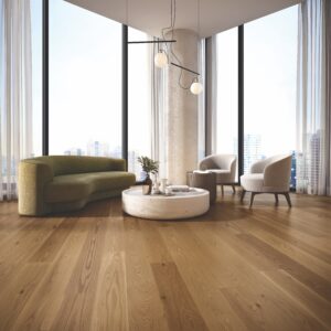 Crafted in Italy, Turin Chevron Corta is a new 5/8-inch engineered hardwood with a 4mm veneer that includes a chevron pattern designed to add sophistication and visual interest to any room. A matte polyurethane coating enhances the wood’s natural tone while providing long-lasting protection.